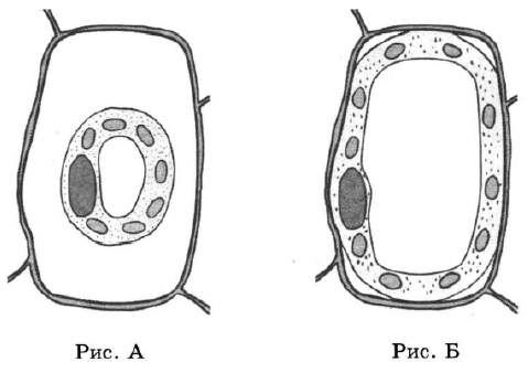 Экспериментатор исследовал изменения, происходящие с расположением цитоплазмы относительно клеточной стенки, в разных условиях. Для этого он приготовил препарат кожицы лука, рассмотрел его под микроскопом, обратив внимание на расположение цитоплазмы относительно клеточной стенки, затем он нанес на предметное стекло каплю раствора поваренной соли, наблюдал за изменением положения цитоплазмы, зарисовал увиденное (рис. А). В дальнейшем экспериментатор фильтровальной бумагой удалил раствор поваренной соли и нанес на предметное стекло несколько капель воды, наблюдал за изменением положения цитоплазмы, зарисовал увиденное (рис. Б).