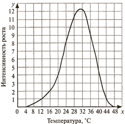 Ученые провели эксперимент по изучению зависимости интенсивности роста проростков кукурузы от температуры. Результаты эксперимента представлены на графике.