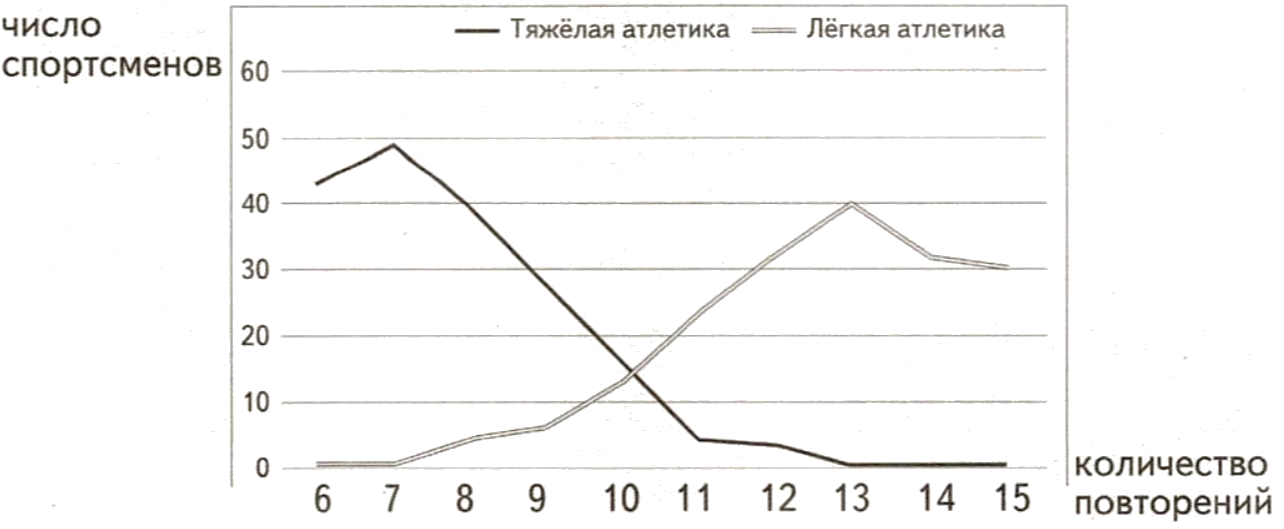 Экспериментатор изучал особенности строения волокон двуглавой мышцы плеча (musculus biceps brachii) у спортсменов, занимающихся разными видами спорта. Для этого он измерял количество повторений упражнения до полного отказа мышцы у тяжелоатлетов и легкоатлетов. Для спортсменов, у которых отказ мышцы происходил при 10 или меньше повторениях, наблюдалось преобладание белых волокон двуглавой мышцы плеча. Если мышца отказывала при большем количестве повторений, то преобладали красные волокна. Результаты эксперимента представлены на графике.