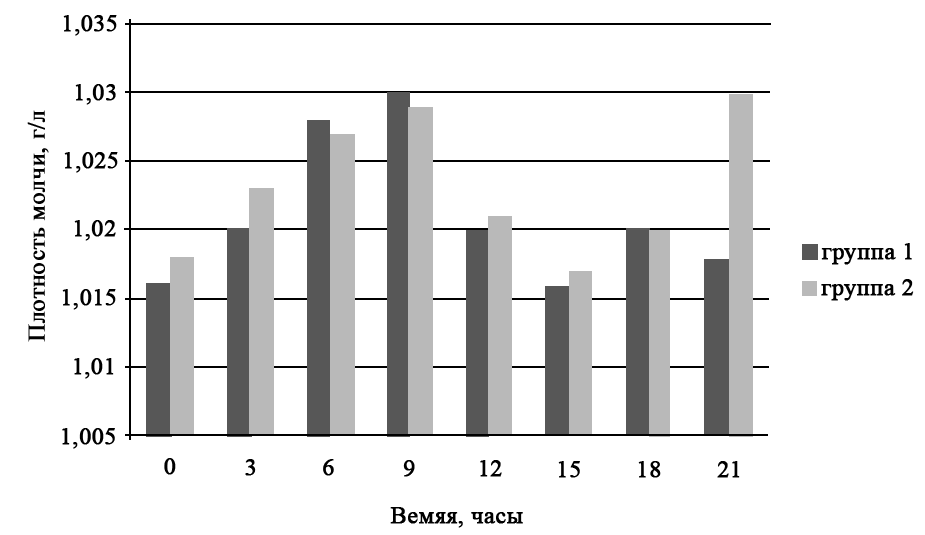 Экспериментатор изучал особенности физиологии выделительной системы человека. Для этого две группы добровольцев сдавали образцы мочи в течение дня для определения ее плотности. Результаты приведены на графике.