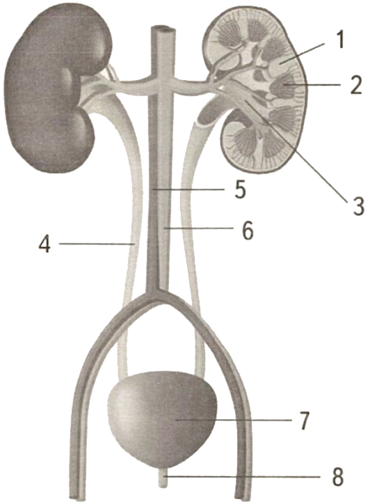 Установите соответствие между характеристиками и структурами почки, обозначенными на рисунке цифрами 1, 2, 3: к каждой позиции, данной в первом столбце, подберите соответствующую позицию из второго столбца.
