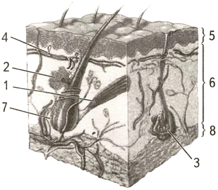 Установите соответствие между характеристиками и структурами кожи, обозначенными на рисунке цифрами 1, 2, 3: к каждой позиции, данной в первом столбце, подберите соответствующую позицию из второго столбца.
