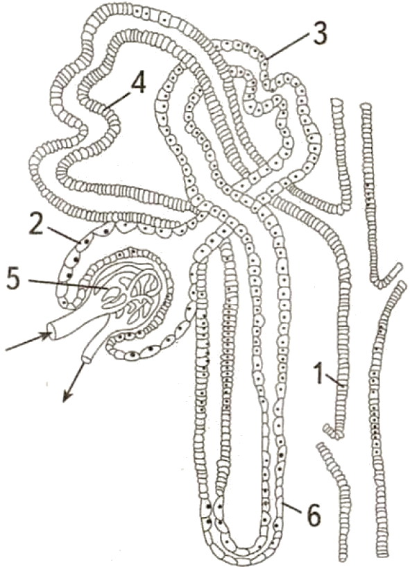 Установите соответствие между характеристиками и структурами нефрона, обозначенными на рисунке цифрами 1, 2, 3: к каждой позиции, данной в первом столбце, подберите соответствующую позицию из второго столбца.