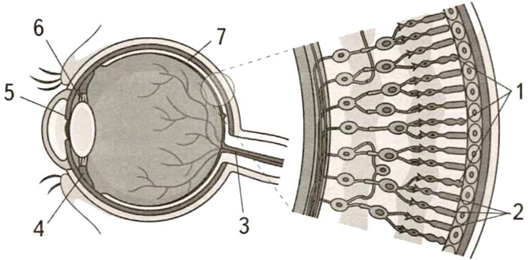 Установите соответствие между характеристиками и фоторецепторами, обозначенными на рисунке цифрами 1, 2: к каждой позиции, данной в первом столбце, подберите соответствующую позицию из второго столбца.