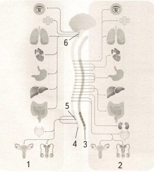 Установите соответствие между характеристиками и отделами вегетативной нервной системы человека, обозначенными на рисунке цифрами 1, 2, 3: к каждой позиции, данной в первом столбце, подберите соответствующую позицию из второго столбца.