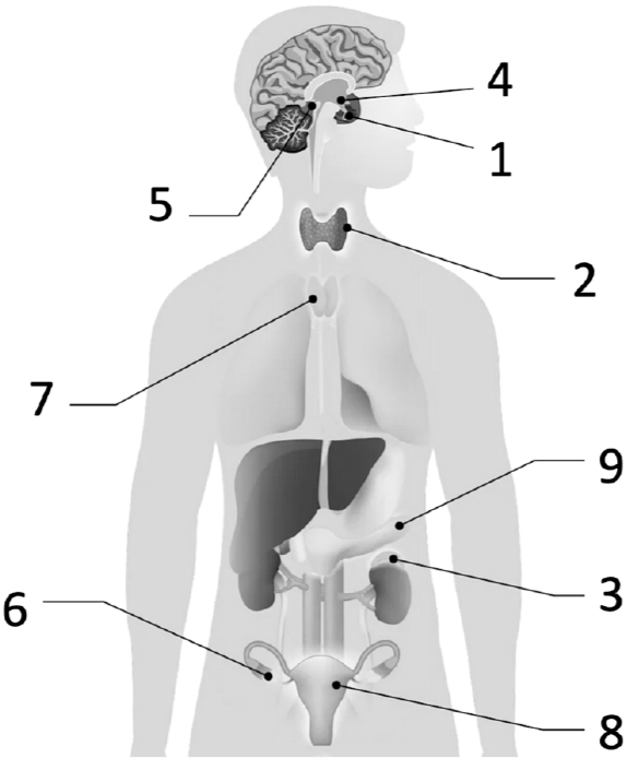 Установите соответствие между характеристиками и железами человека, обозначенными на рисунке цифрами 1, 2, 3: к каждой позиции, данной в первом столбце, подберите соответствующую позицию из второго столбца.