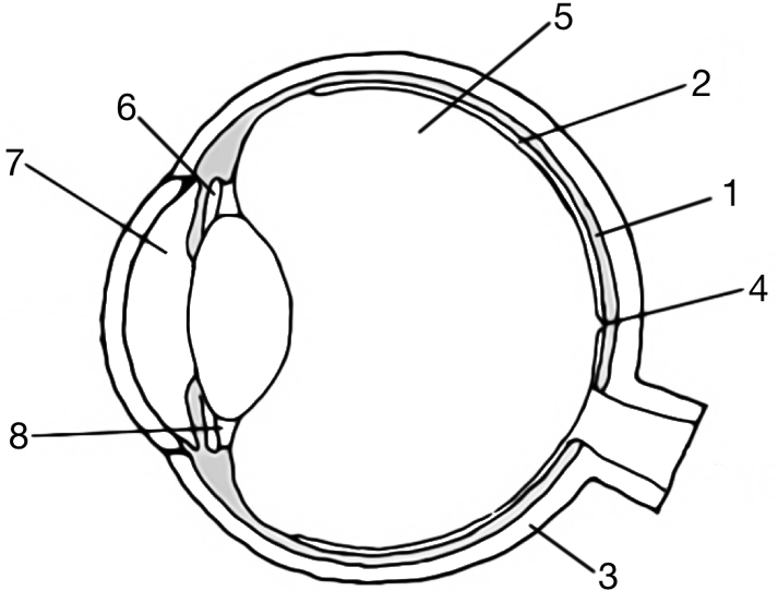 Установите соответствие между характеристиками и оболочками глаза, обозначенными на рисунке цифрами 1, 2, 3: к каждой позиции, данной в первом столбце, подберите соответствующую позицию из второго столбца.