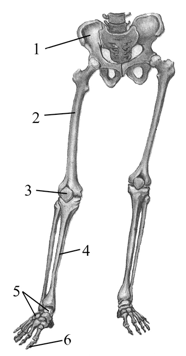 Выберите три верно обозначенные подписи к рисунку, на котором изображены тазовый пояс и скелет свободной нижней конечности человека.
