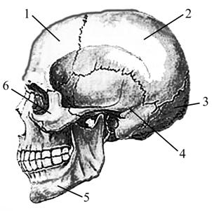 Выберите три верно обозначенные подписи к рисунку «Череп человека». Запишите в таблицу цифры, под которыми они указаны.
