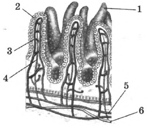 Выберите три верно обозначенные подписи к рисунку, на котором изображено строение кишечных ворсинок.