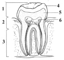 Выберите три верно обозначенные подписи к рисунку, на котором изображено строение зуба.