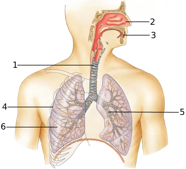 Выберите три верно обозначенные подписи к рисунку, на котором изображено строение дыхательной системы человека.