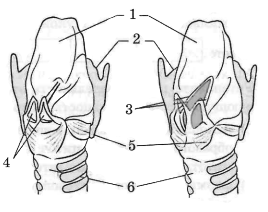 Выберите три верно обозначенные подписи к рисунку, на котором изображено внутреннее строение гортани.