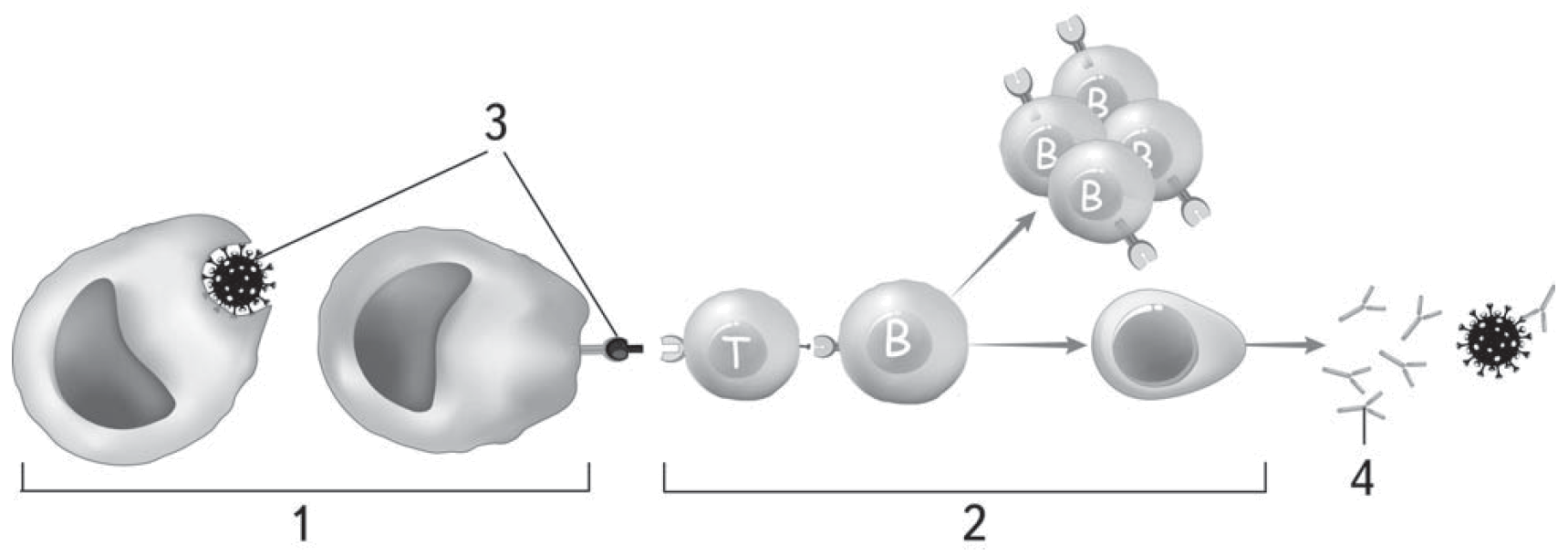 На схеме представлена реакция иммунного ответа. Укажите, какой цифрой (1 или 2) обозначен гуморальный иммунитет. Как называются объекты, обозначенные цифрами 3 и 4? К какой группе химических веществ относятся антитела? Какими органоидами они образуются и в каких клетках?