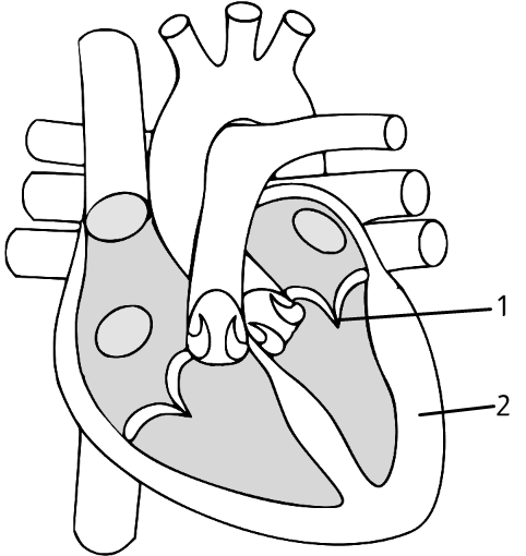 1) 1 — двустворчатый клапан, 2 — мышечная стенка левого желудочка (миокард);