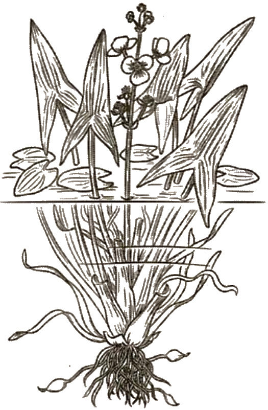 4) у стрелолиста, растущего на берегу, будут стреловидные листья на длинных черешках.