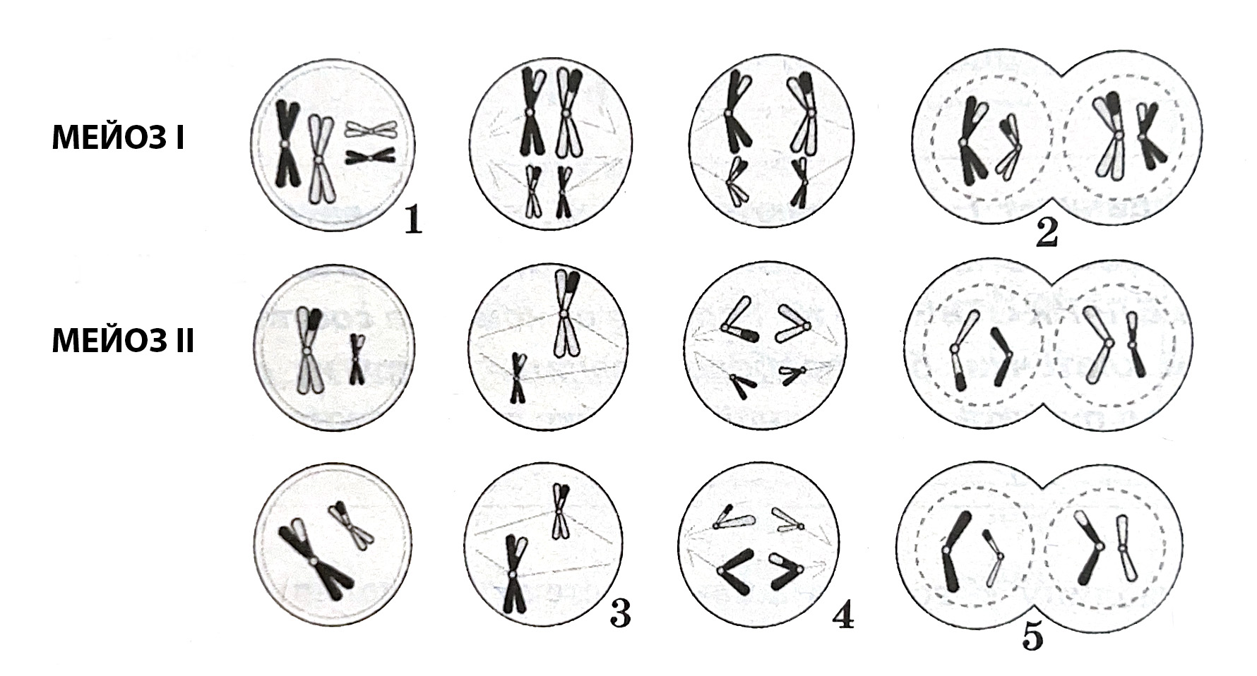 Установите соответствие между признаками и фазами мейоза, обозначенными цифрами на схеме: к каждой позиции, данной в первом столбце, подберите соответствующую позицию из второго столбца.