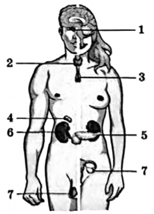 Установите соответствие между характеристиками и железами человека, обозначенными на рисунке цифрами 1, 2: к каждой позиции, данной в первом столбце, подберите соответствующую позицию из второго столбца.