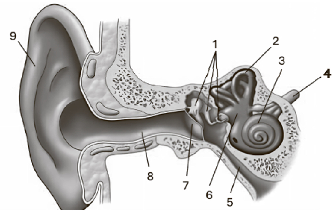 Установите соответствие между характеристиками и структурами уха человека, обозначенными на рисунке цифрами 1, 2, 3: к каждой позиции, данной в первом столбце, подберите соответствующую позицию из второго столбца.