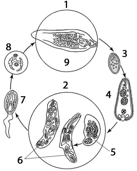 Под каким номером на схеме жизненного цикла паразита обозначена циста?