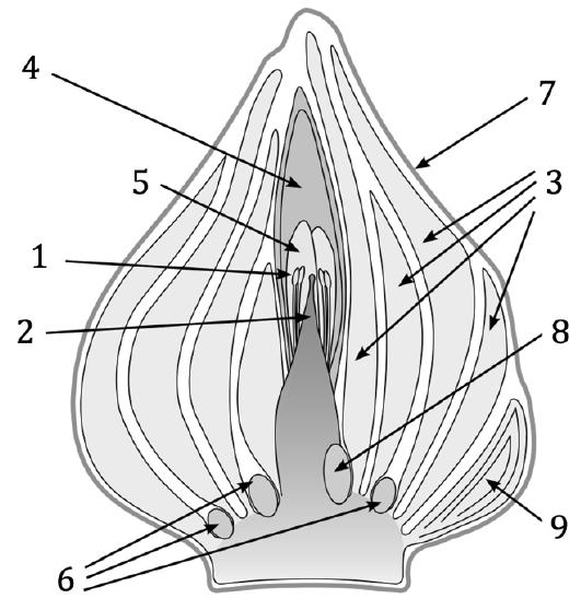 Какой цифрой на рисунке луковицы тюльпана обозначена кроющая чешуя?