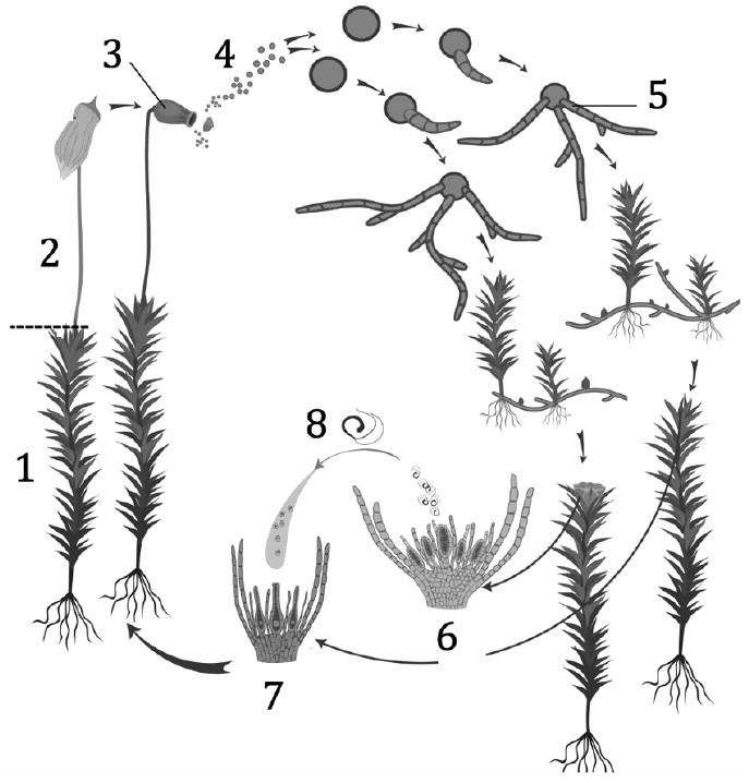Установите соответствие между характеристиками и стадиями жизненного цикла мха, обозначенными на рисунке цифрами 1 и 2: к каждой позиции, данной в первом столбце, подберите соответствующую позицию из второго столбца.