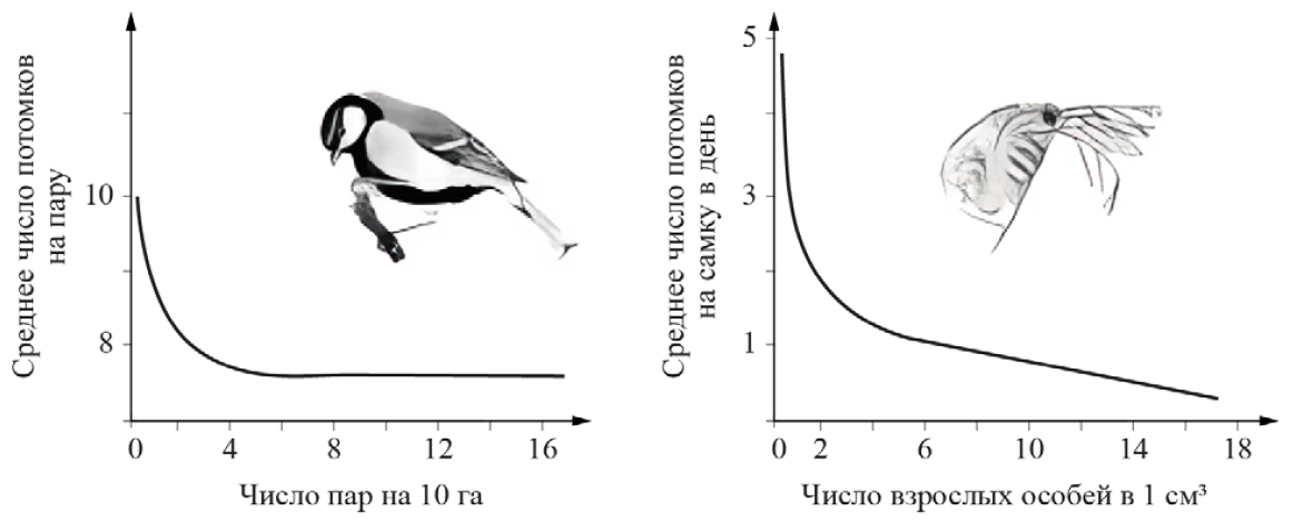 Проанализируйте графики «Зависимость рождаемости от плотности в дикой популяции большой синицы и в лабораторной популяции дафний».