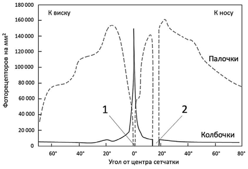 1) участок 1 − жёлтое пятно (центральная ямка);