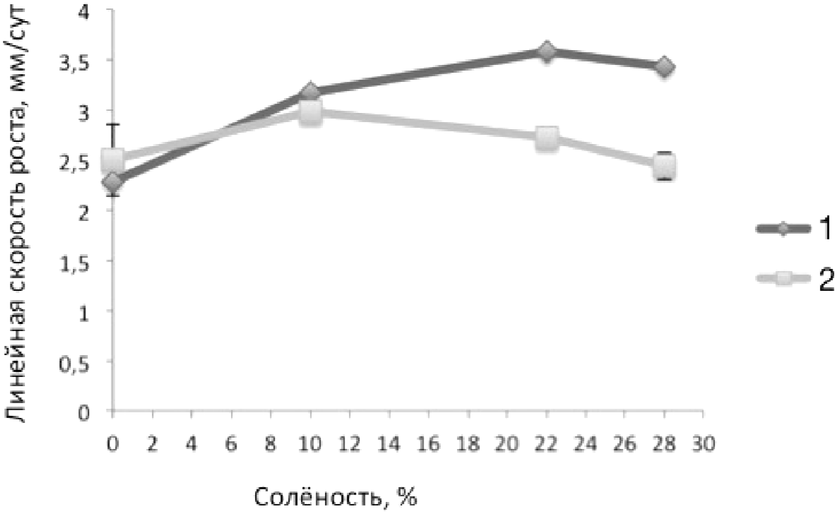 Ученый изучал влияние солености среды на скорость роста плесневых грибов. Свой эксперимент исследователь проводил в специальных стеклянных трубках, в которые высевал чистые культуры грибов двух разных видов (1 и 2) на питательные средах с соленостью 0, 10, 22 и 28 % (промилле). Культивировались грибы при постоянной температуре 23°C и со свободным доступом воздуха. Измерение величины колоний плесневых грибов проводилось через 22 дня после посева. После измерения была посчитана скорость роста колоний (мм/сут) при каждом значении солености. Результаты представлены на графике.