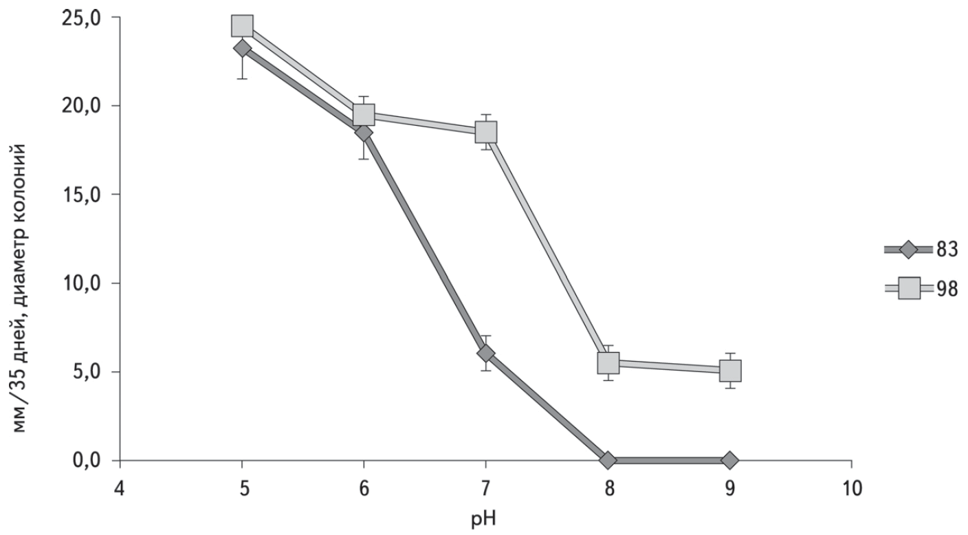Учёный изучал скорость роста грибов при разной кислотности (рН). Свой эксперимент исследователь проводил на питательных средах со значениями pH 5, 6, 7, 8, 9, куда высевал чистые культуры грибов (А и Б). При значениях рН<7 среда кислая, при значениях pH>7 среда щелочная. Инкубировались грибы в темноте, при постоянной температуре 20°С и со свободным доступом воздуха. Измерения колоний проводились через 35 дней после посева. После измерения была посчитана скорость роста колоний (мм/35 дней) при каждом значении pH. Результаты представлены на графике.
