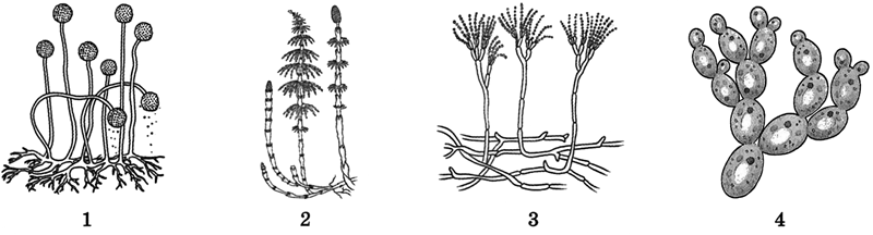 A) Многоклеточный мицелий Б) Заросток в цикле развития B) Кистевидные спорангиии Г) Одноклеточная грибница Д) Спороносный колосок Е) Антеридии, архегонии  |