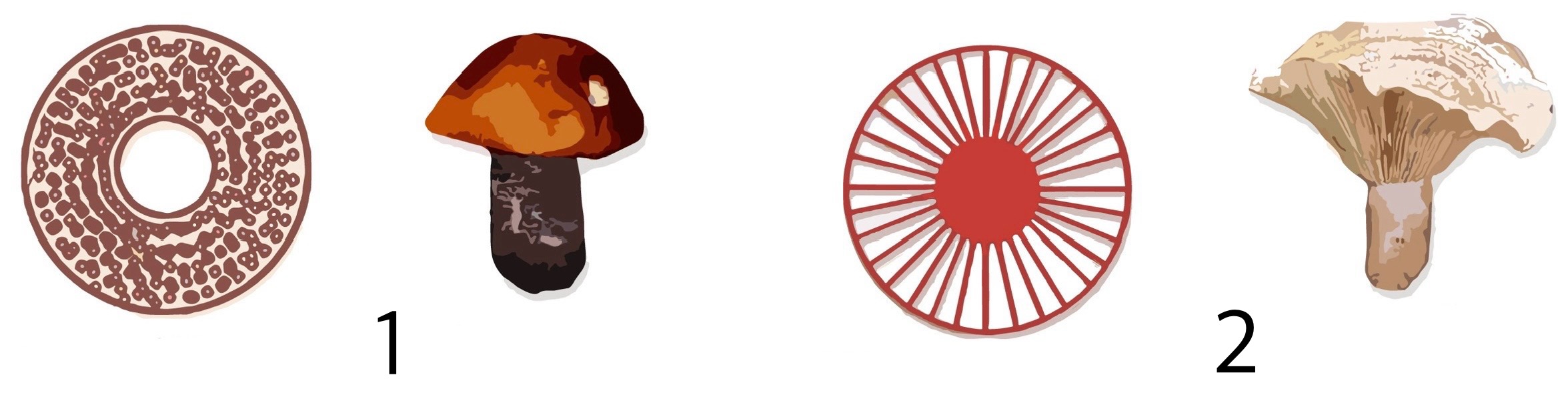 Установите соответствие между шляпочными грибами и группами, к которым они относятся, обозначенными на рисунке цифрами 1 и 2. Для этого к каждому элементу первого столбца подберите соответствующий элемент из второго столбца.