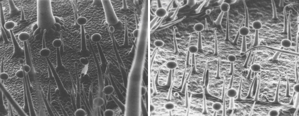 Рассмотрите электронные фотографии поверхности листьев растений. Как называются структуры на поверхности листьев и какие функции они выполняют? Укажите четыре функции. Производными какой ткани являются эти образования?