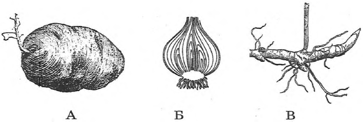 Какие органы растений обозначены на рисунке буквами А, Б, В? В чем состоит их роль в жизни растений? Видоизменением какого органа они являются?