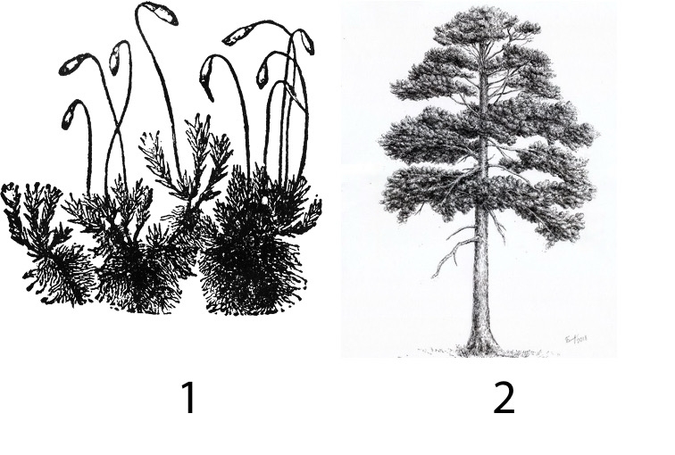 Установите соответствие между признаками и отделами растений, обозначенными на рисунке цифрами 1 и 2: к каждой позиции, данной в первом столбце, подберите соответствующую позицию из второго столбца.