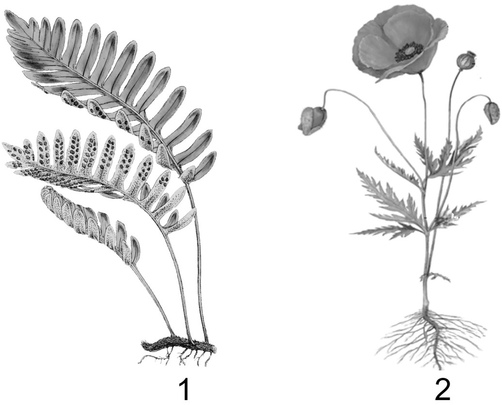 Рассмотрите растения, изображенные на рисунках 1 и 2. Определите отделы, к которым их относят. Укажите по два признака, по которым Вы отнесли изображенные растения к этим отделам. Чем представлены гаметофиты изображенных растений?