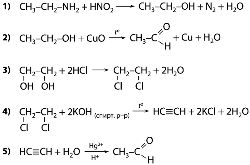 X1 ———→ HNO2 этанол ———→ CuO, t˚ X2 ← X3 ←————— KOH (спирт), t˚ X4 ← этиленгликоль
