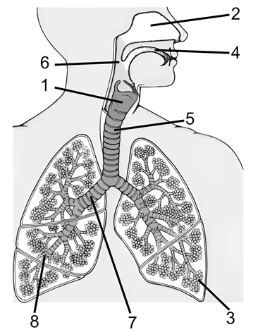 Установите соответствие между характеристиками и структурами дыхательной системы человека, обозначенными на рисунке цифрами 1, 2, 3: к каждой позиции, данной в первом столбце, подберите соответствующую позицию из второго столбца.