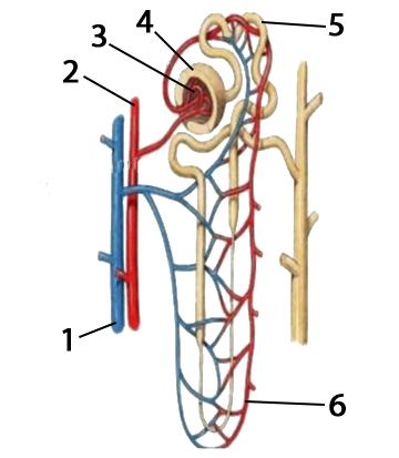 Выберите три верно отмеченные подписи к рисунку, на котором изображено строение нефрона человека. Запишите цифры, под которыми они указаны.