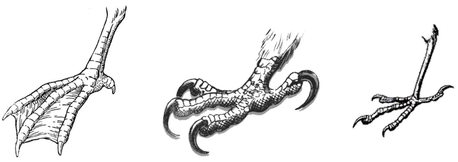 Рассмотрите рисунки конечностей птиц разных отрядов. Заполните пустые ячейки таблицы, используя элементы, приведенные в списке. Для каждой ячейки, обозначенной буквой, выберите соответствующий элемент из предложенного списка.