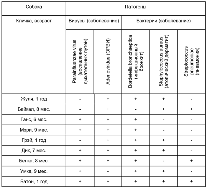 Проанализируйте таблицу «Разнообразие бактерий и вирусов при респираторных инфекциях у собак».