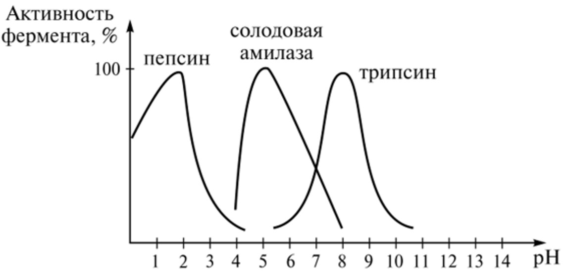 Проанализируйте график зависимости активности фермента от значения pH среды (по оси х отложено значение pH среды, а по оси у скорость ферментативной реакции).