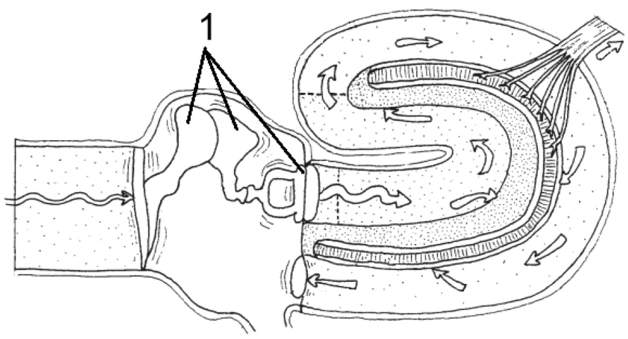 На схеме изображен фрагмент анализатора. Определите тип анализатора. Какой отдел (какая часть) анализатора представлен(а) на схеме? Какие две функции выполняют структуры, обозначенные цифрой 1? Как называется полость, в которой находятся эти структуры?