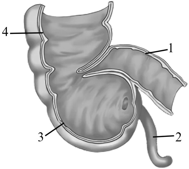 НЕТ ОТВЕТАНазвать орган под цифрой 3, отдел, к которому он относится. У кого этот орган больше, у человека или у мелкого рогатого скота?