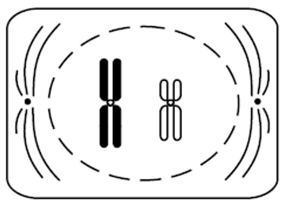 Назовите тип и фазу деления исходной диплоидной клетки, изображенной на схеме. Ответ обоснуйте. Какое биологическое значение имеет этот тип деления клетки? Укажите два значения.