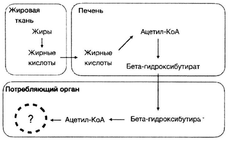 В последние годы приобрела высокую популярность кетогенная диета. При таком типе диеты в организм с пищей углеводы почти не поступают и заменяются жирами. В печени у людей с такой диетой из жирных кислот синтезируются кетоновые тела, например бета-гидроксибутират. Последнее соединение клетки могут использовать для получения энергии. В какой метаболический путь включаются продукты распада бета-гидроксибутирата? Какие продукты образуются в этом метаболическом пути? Почему такая диета может привести к значительному снижению веса при умеренном потреблении жиров? Одним из следствий диеты является повышенная концентрация кетоновых тел в крови. Почему такое же состояние встречается у больных диабетом 1-го типа*?