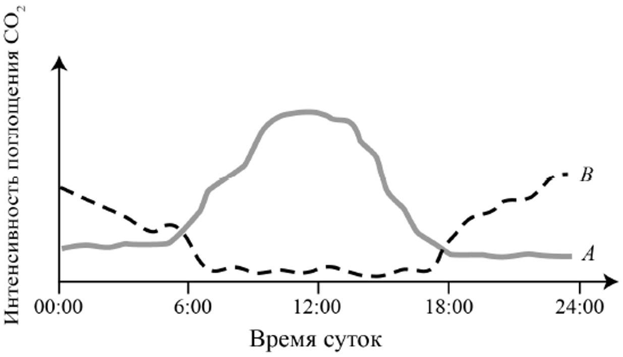 На графике показана зависимость поглощения углекислого газа от времени суток для двух наземных растений. Какие структуры обеспечивают поступление углекислого газа в организм наземных растений? Какой буквой на графике обозначено растение-суккулент, обитающее в пустыне? Ответ поясните, исходя из особенностей физиологии растений.