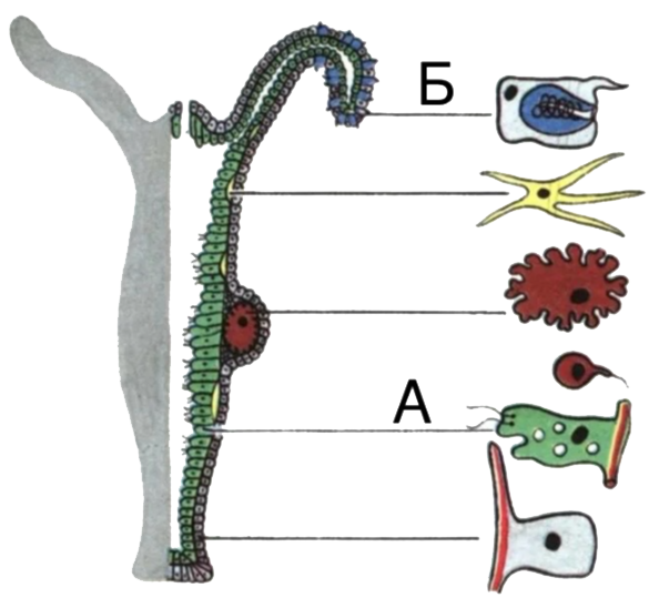 Под буквой А — пищеварительно–мускульная клетка, обеспечивающая внутриклеточное пищеварение или движение. Имеет энтодермальное происхождение (внутренний зародышевый листок).