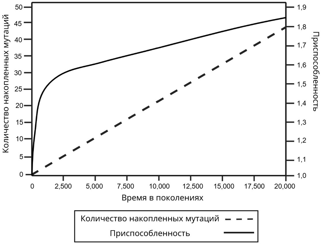 Возникновение новых признаков у организмов происходит за счет накопления мутаций. В эксперименте измерялось количество накопленных мутаций у кишечной палочки (Escherichia coli) в зависимости от времени после перемещения культуры в новую среду обитания. Почему количество мутаций растет линейно, в то время как приспособленность сначала резко возрастает, а затем скорость ее роста замедляется? Почему в аналогичном эксперименте с пекарскими дрожжами (Saccharomyces cerevisiae) потребовалось примерно вдвое больше времени (в поколениях) для аналогичного роста приспособленности? Ответ поясните, исходя из особенностей наследственного аппарата бактерий и дрожжей.