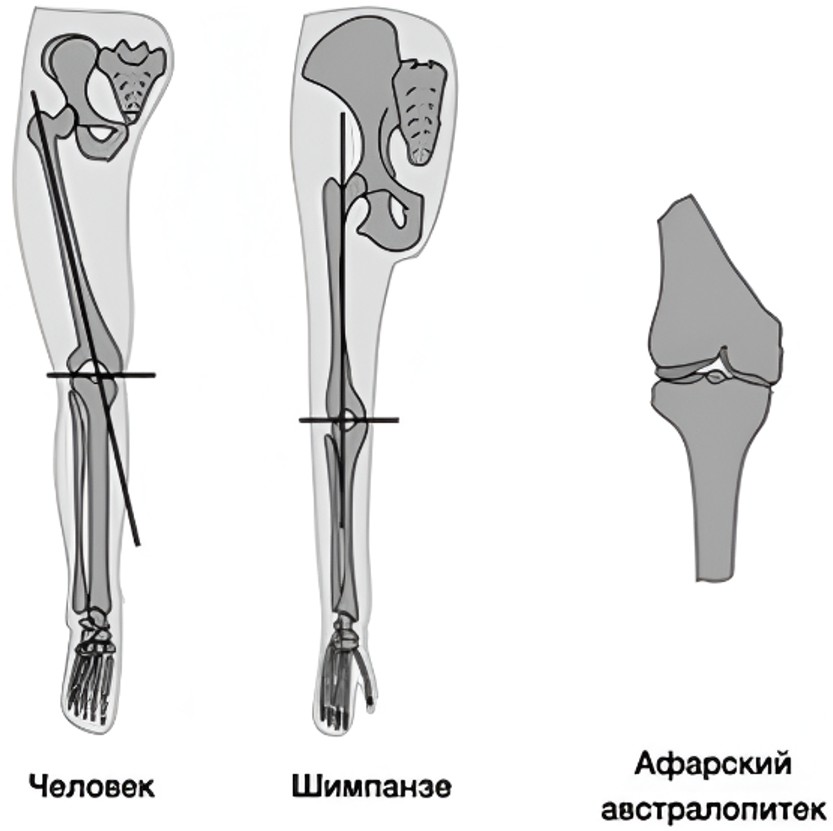 Известно, что строение коленного сустава различается у человека и человекообразных обезьян. Так, у человека кости коленного сустава расположены под углом, тогда как у шимпанзе расположены прямо. Почему, в отличие от шимпанзе, в процессе эволюции коленный сустав человека приобрел такое строение? Какие кости входят в его состав? На основании строения коленного сустава австралопитека предположите, был ли для него характерен обсуждаемый признак гоминидной триады. Ответ поясните.